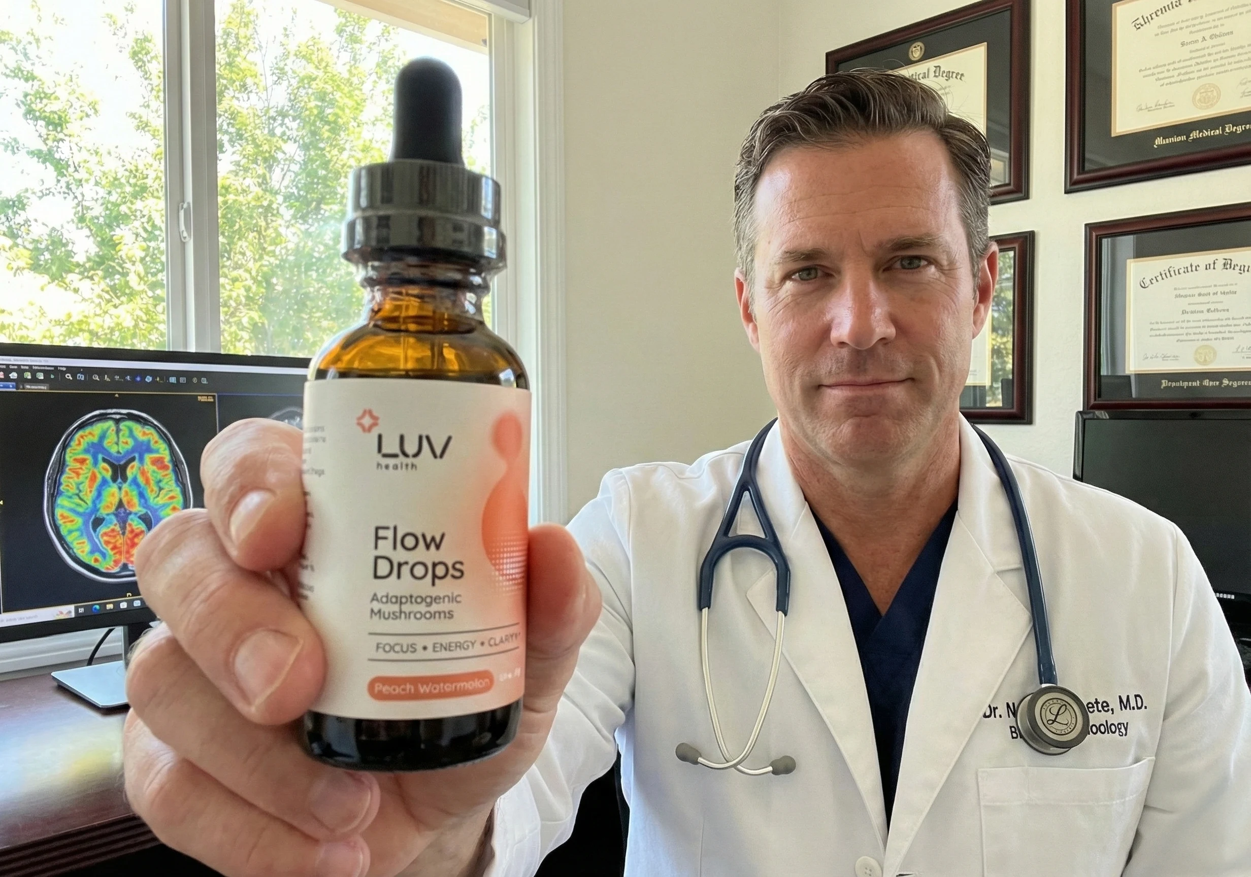 "I've been taking Flow Drops for the past month. As a physician, I'm always looking for ways to improve energy and decrease brain fog without pharmaceuticals. I love Flow Drops. They taste wonderful and are loaded with USDA organic adaptogenic mushrooms. I'm definitely going to continue taking Flow Drops and recommending them to my family, friends, and my patients."